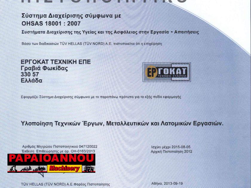 • Στην ανάπτυξη, εγκατάσταση και εφαρμογή ενός Συστήματος Διαχείρισης Ασφάλειας & Υγείας στην Εργασία (ΣΔιΑΥ) κατά OHSAS 18001:2007 μέσα από το οποίο επιδιώκει να αναγνωρίζει όλους τους υφιστάμενους και δυνητικούς κινδύνους για την Ασφάλεια & Υγεία στην Εργασία και να καθιερώνει μέτρα για την εξάλειψη, μείωση ή τον έλεγχό τους.